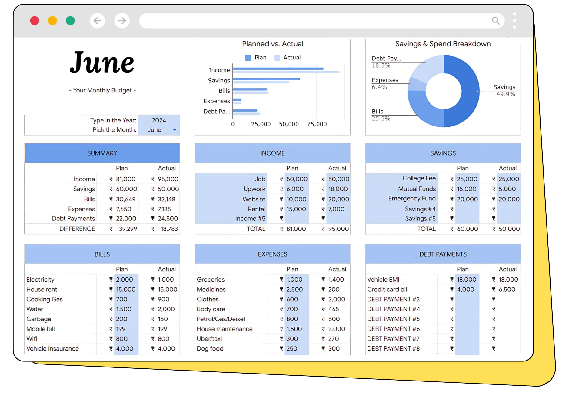 The Dashboard Tab provides a complete overview of every single rupee spent in a particular month, offering a clear and detailed picture of your financial health. Here’s what you can expect: